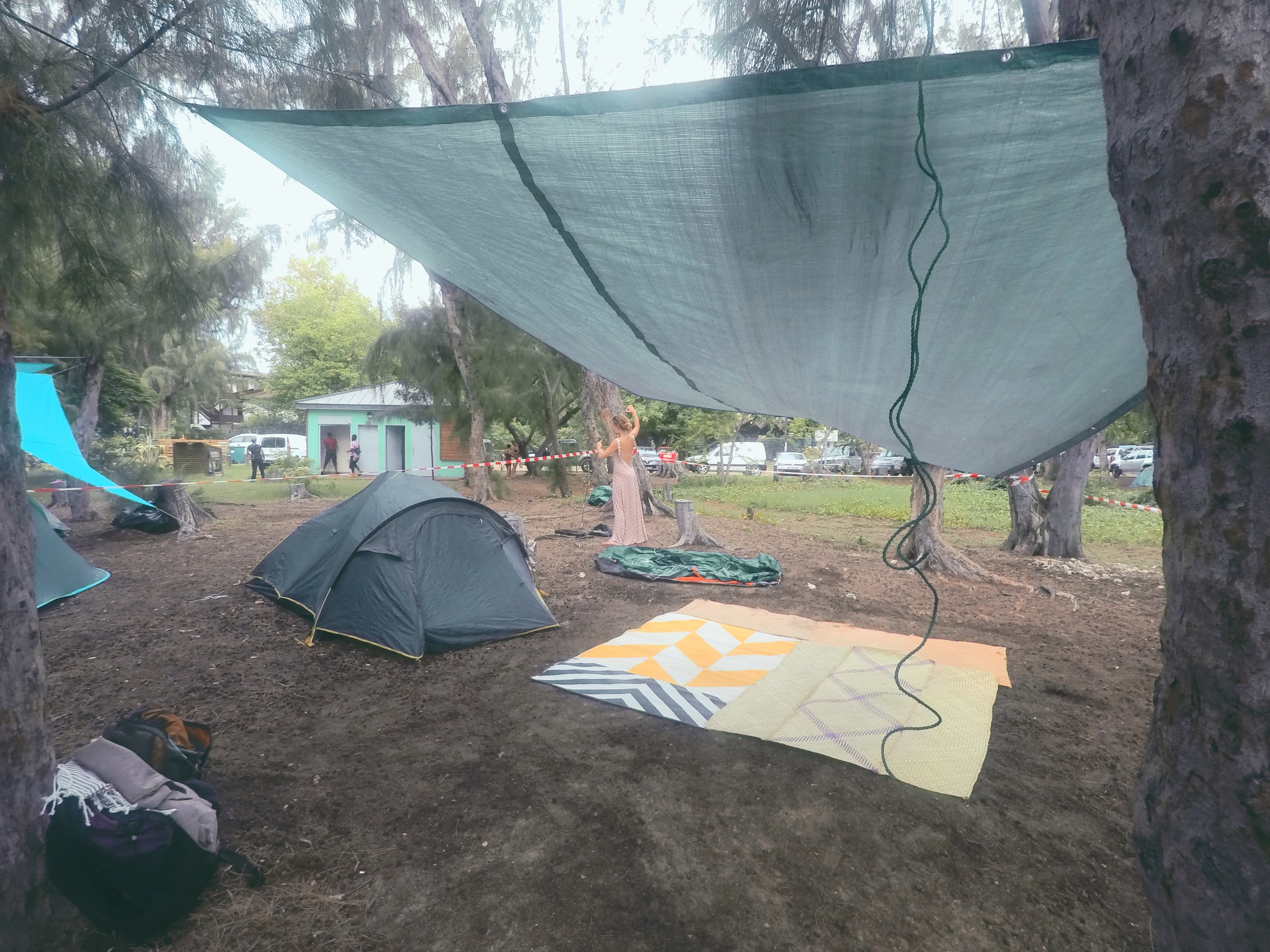 Nous avons eu la chance de rejoindre un groupe qui, de son côté, avait fait tout le travail (je sais, shame on us mais qu’ils voient, dans cet article, un geste de ma reconnaissance), à savoir réserver l’emplacement depuis la veille ou le matin – sous la pluie, installer des bâches au niveau des arbres pour se protéger de la pluie ou du soleil, disposer des tapis de sol, des bancs, des tables pour un buffet, on ne peut plus garni.