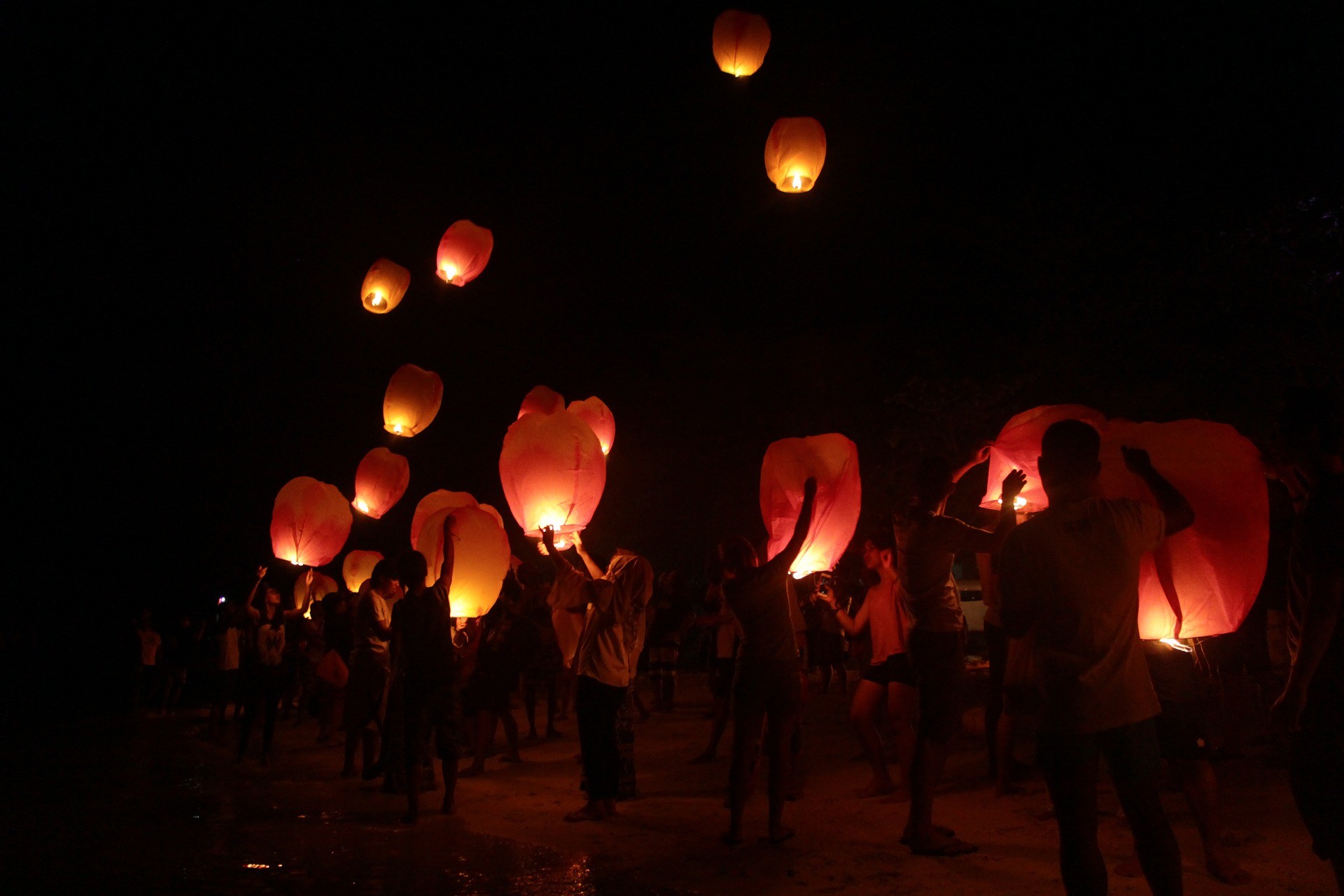 L’excitation : minuit arrive, on le sent. Et tout d’un coup, c’est l’apothéose. Des milliers de feu d’artifices éclatent dans le ciel étoilé. Les pétards retentissent partout. Les lanternes sont désormais plusieurs centaines sur la plage prêtes à décoller. Tout le monde s’embrasse, les bouteilles de champagnes qui s’ouvrent viennent accompagner le bruit des pétards. Me moment est incroyable. On regarde au Sud au Nord, c’est tout le lagon qui vient de s’embraser de milles couleurs sur des centaines et des centaines de mètres. On ne sait plus ou regarder tellement il y en partout.