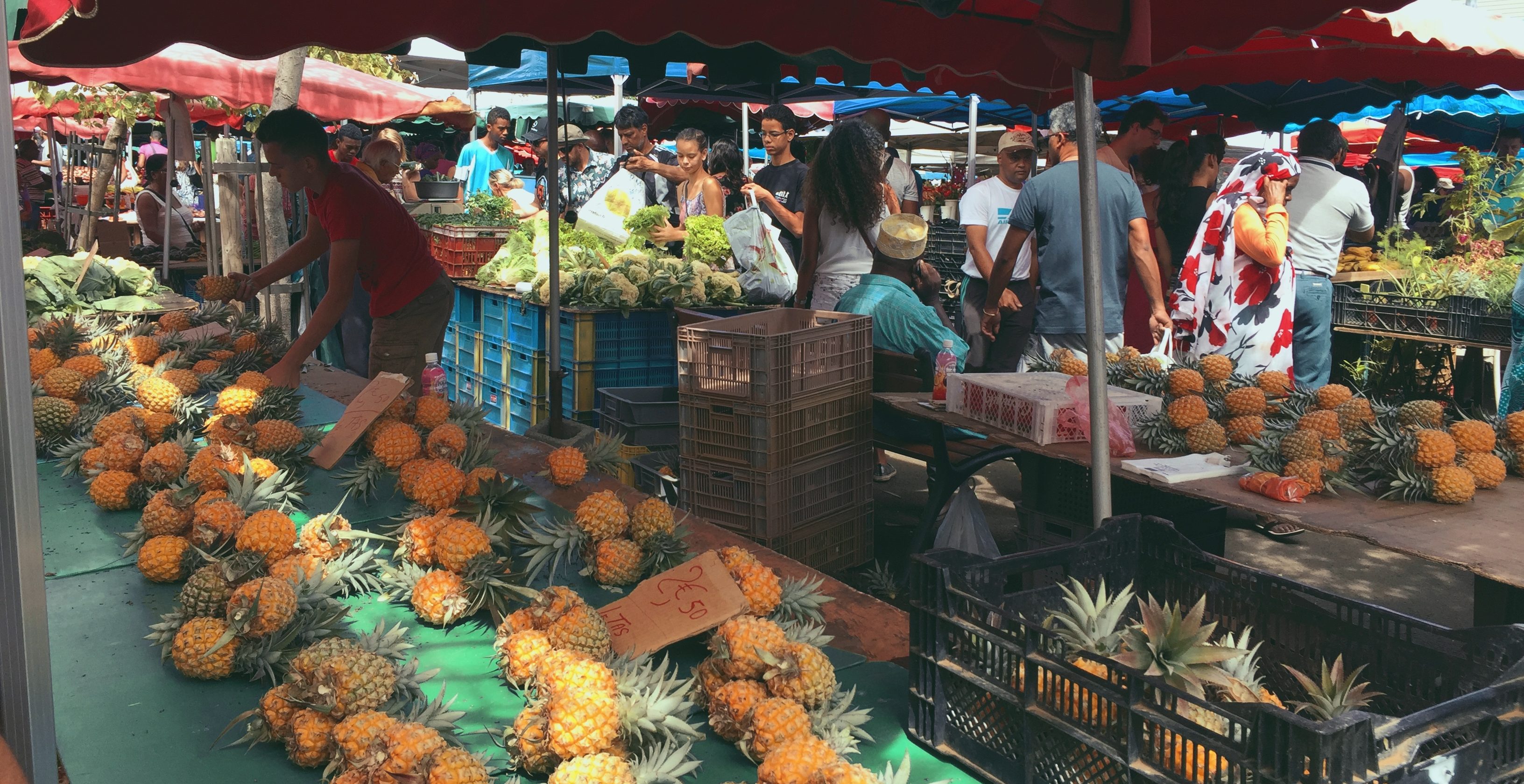- J’en parlais déjà dans mon premier article : pour une consommation locale et fraîche, optez pour les nombreux marchés présents sur l’île. Mon coup de cœur va pour celui du Chaudron, à Saint-Denis. Probablement, le moins cher de l’île et le plus typique. En venant en fin de marché, certains maraîchers bradent leurs produits : une bonne astuce !